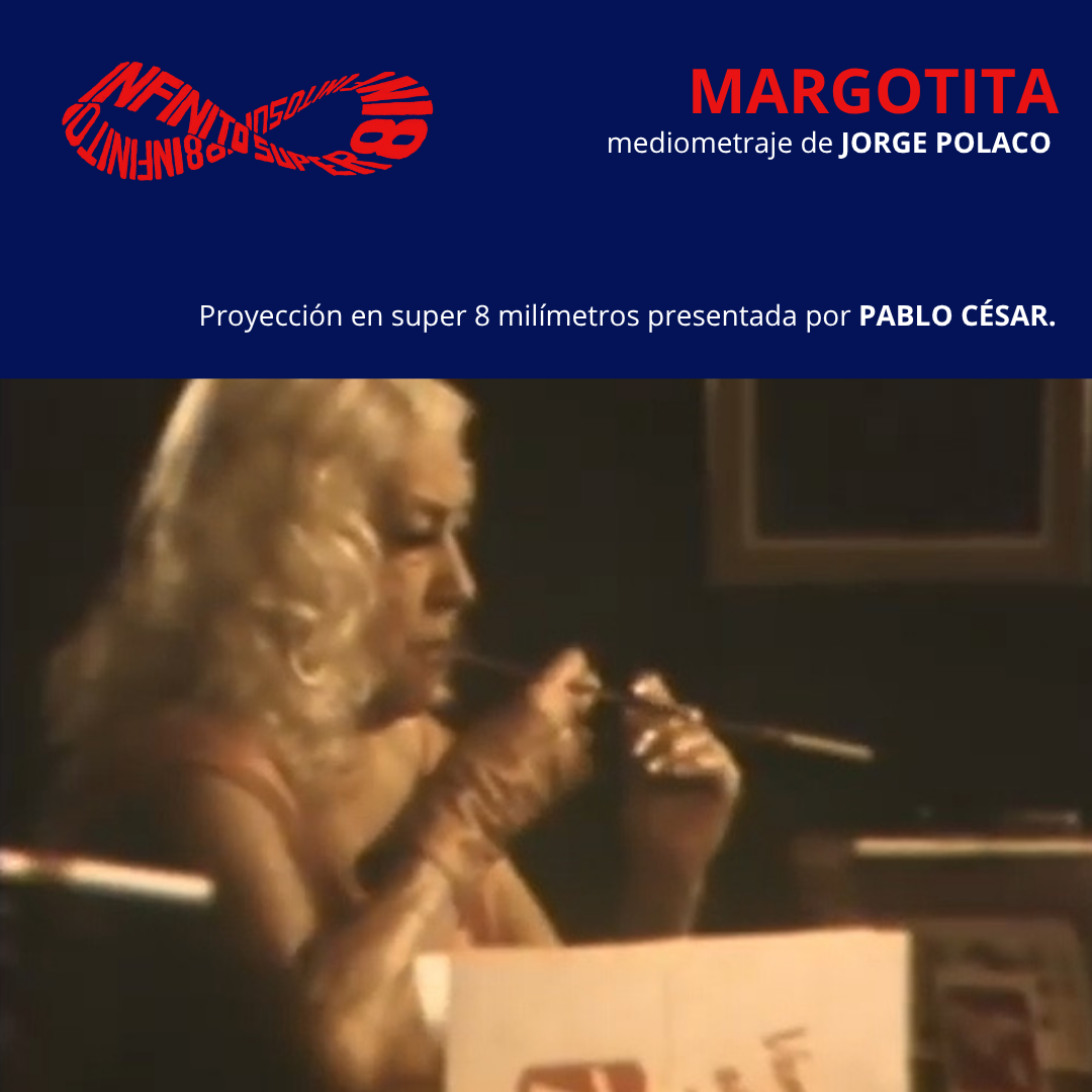 En el marco de la segunda edición del festival Infinito Super 8, como una de sus actividades especiales se proyectará en su formato original Margotita (1984, 28'), mediometraje protagonizado por la singular Margot Moreyra y dirigido por el recordado cineasta y guionista Jorge Polaco. La proyección acompañará la muestra de Cine al Margen, en el Museo del Cine y contará con la presentación del cineasta Pablo César, quien se ocupó de la cámara en el rodaje del film.